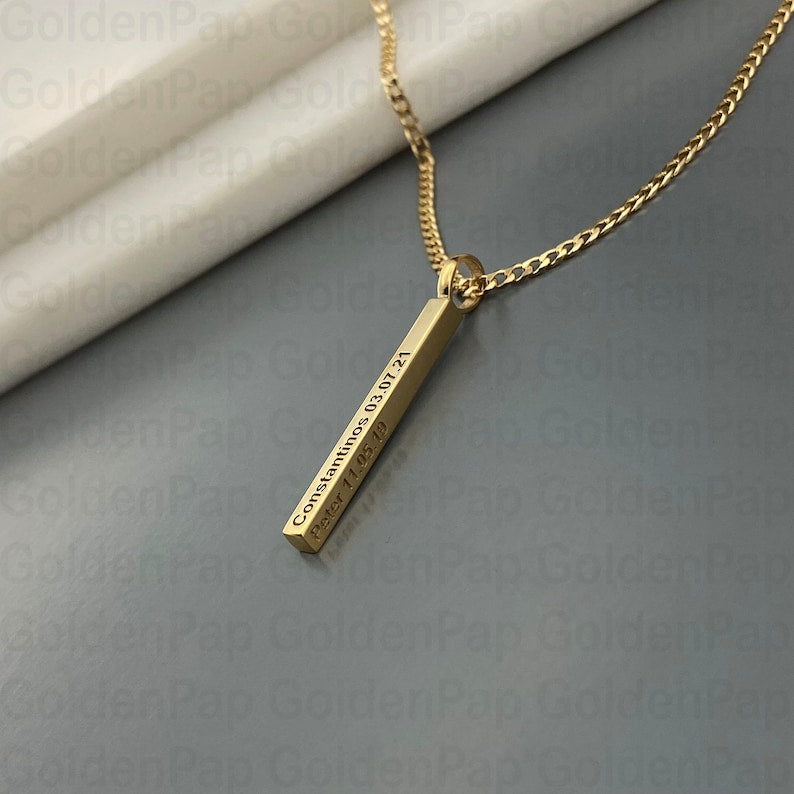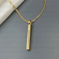 This Cross Bar Pendant Necklace is a meaningful expression of faith and refined style. Designed with a sleek vertical bar pendant, it features the engraved Bible verse “Jeremiah 29:11” complemented by a subtle cross detail at the base, symbolizing hope, guidance, and trust.